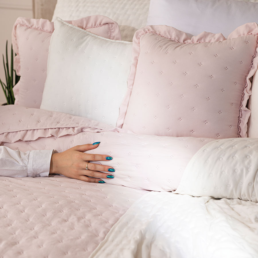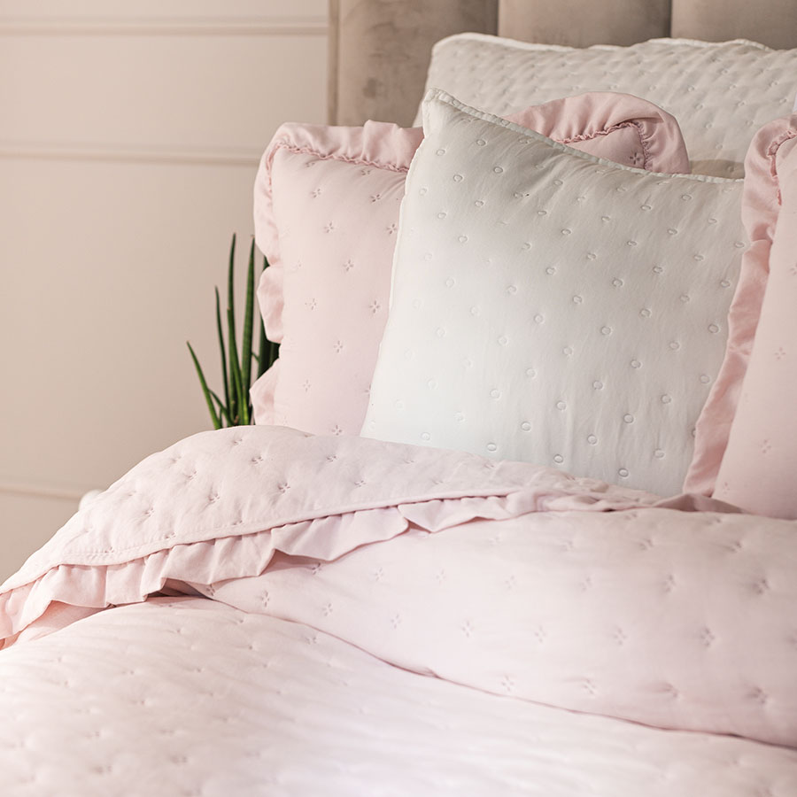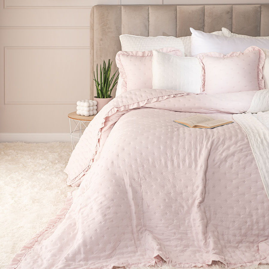 Bardzo miła w dotyku narzuta dekoracyjna z falbaną.